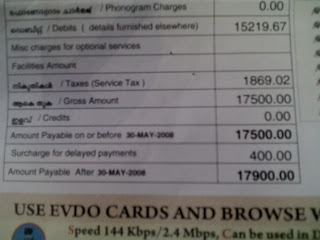 Posted by aswinrulez at Thursday, May 22, 2008 Labels: high net bill, my telephone bill, the highest telephone bill ever Thursday, May 22, 2008Today at 1:30 i got my telephone bill. As usual i didn't take a look cause my net will always be high than it is supposed to be. When the post man came my sister went to take it from him. The moment she got the bill she screamed for my mother. I didn't know what happened so i too went to check on it and you wont believe what i saw.My phone...whew...it was one of kind...never before seen. My telephone bill for one month was Rs.17,900 thats about 414.78394 U.S dollars.